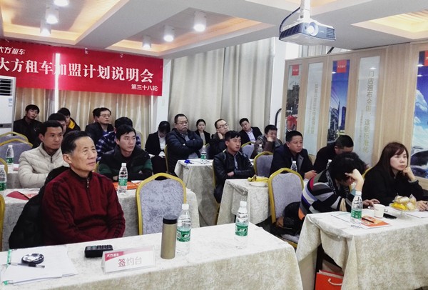 2016年1月9日,大方租车再度起航,召开了第38轮加盟计划说明会,来自全国各地的投资商济济一堂,共同探讨租车行业竞争不断激烈的今天汽车租赁“新打法”。最终,来自甘肃陇南、湖北仙桃、江西武宁等地的多位投资商被大方的发展蓝图所吸引,签订了加盟协议,将会场气氛推向高潮。